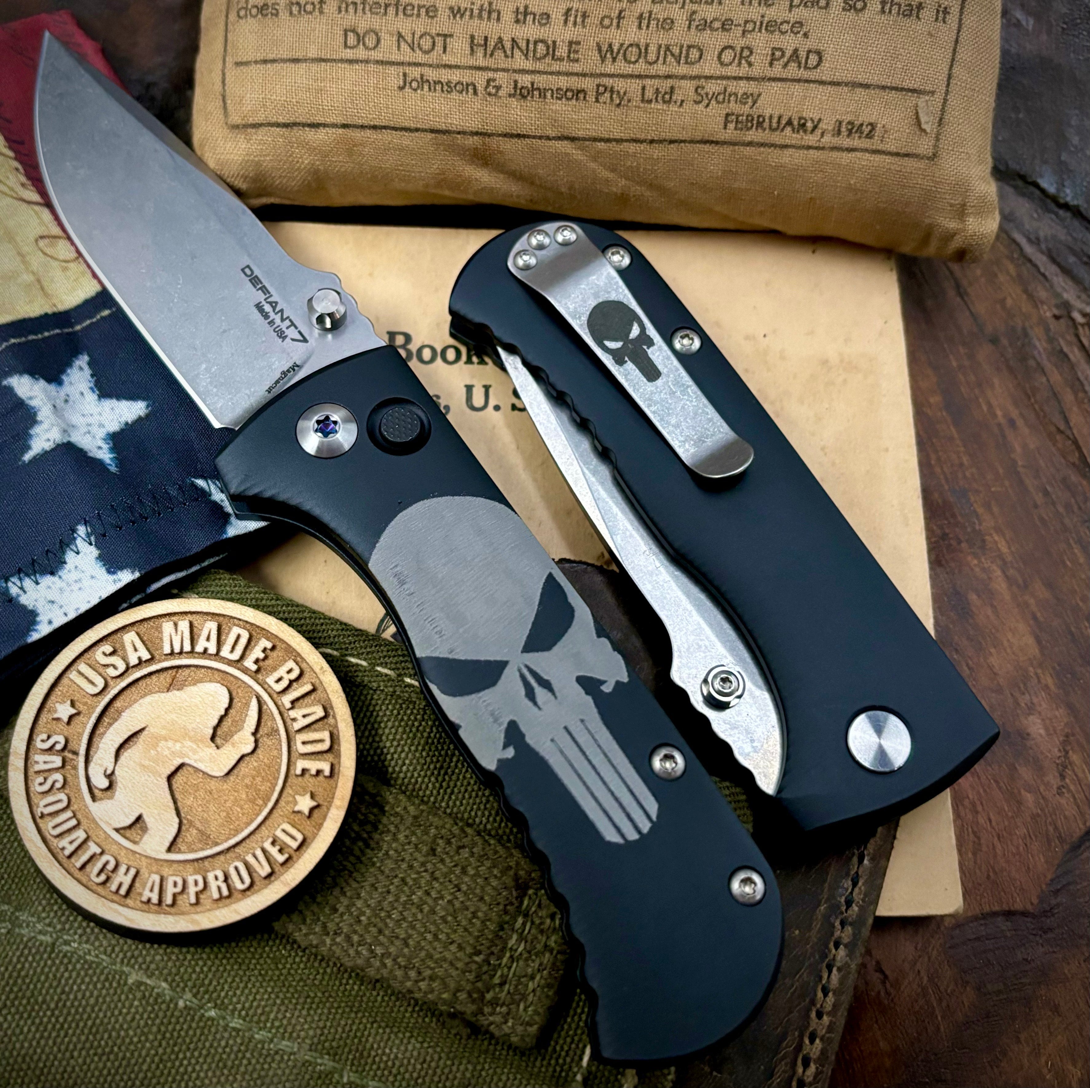 This Defiant-7 Castle Edition was customized in house by USA Made Blade. The presentation side was done up with a big skull. We then added a small skull to the pocket clip. Work done does not void or affect the Defiant-7 warranty.