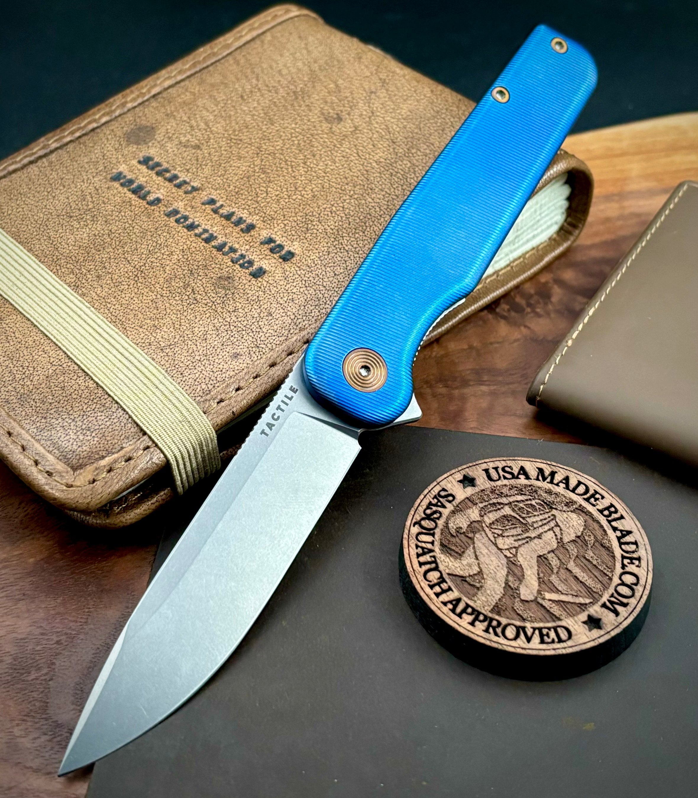 Anodized in house by USA Made Blade.   We anodized this Tactile Rockwall Flipper with a beautiful Blue finish and bronze anodized the hardware.   The combo leaves a stunning finish that just fits this knife perfectly.     Work done does not void the warranty.