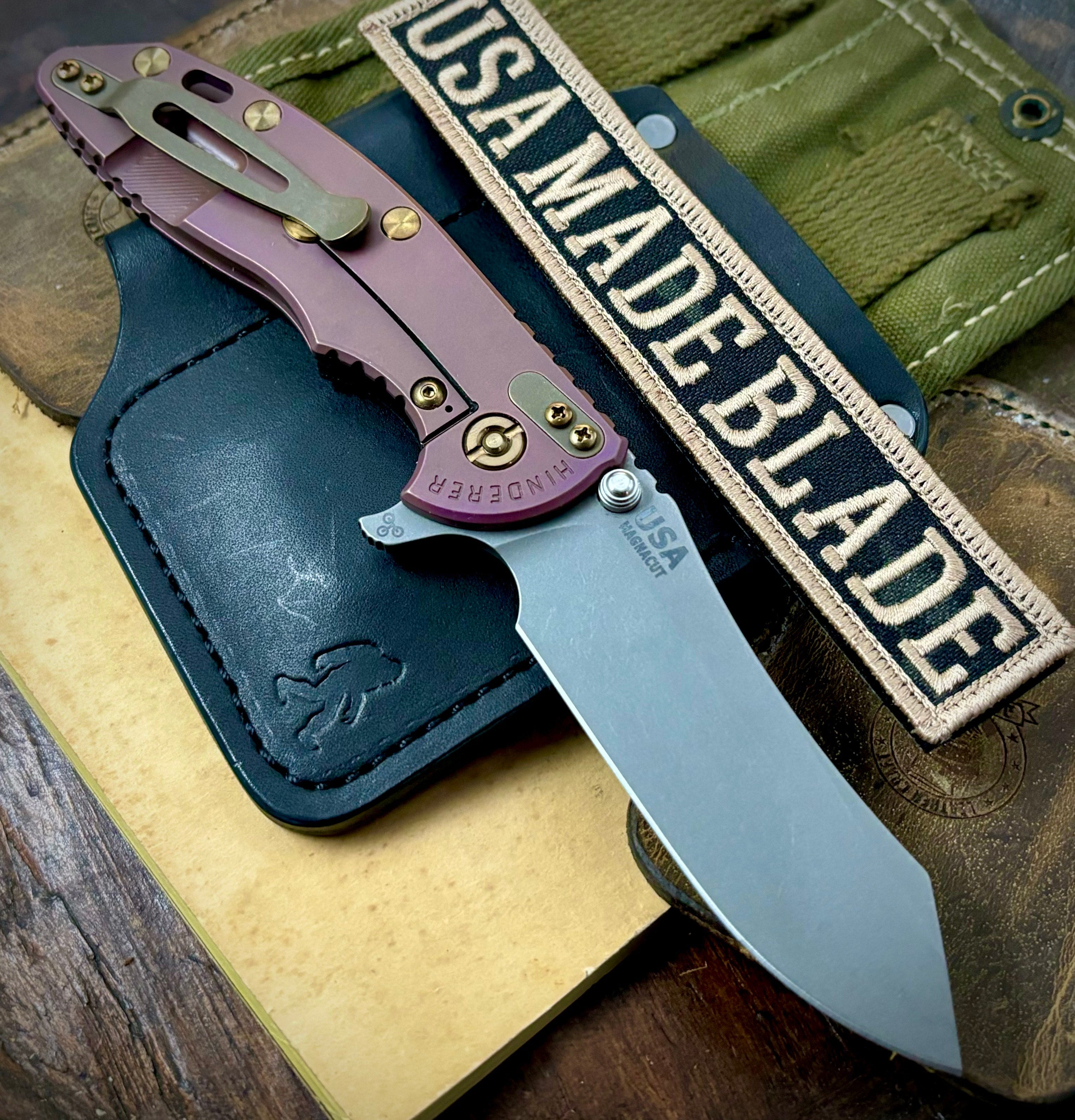 Customized in house by USA Made Blade. This Hinderer XM-18 3.5" Skinny Skinner was done up with our High Res Battle Purple on the ti. We then bronze heat anodized the hardware for a stunning finish. Work done does not void the Hinderer Warranty as we are there only authorized anodizing dealer!