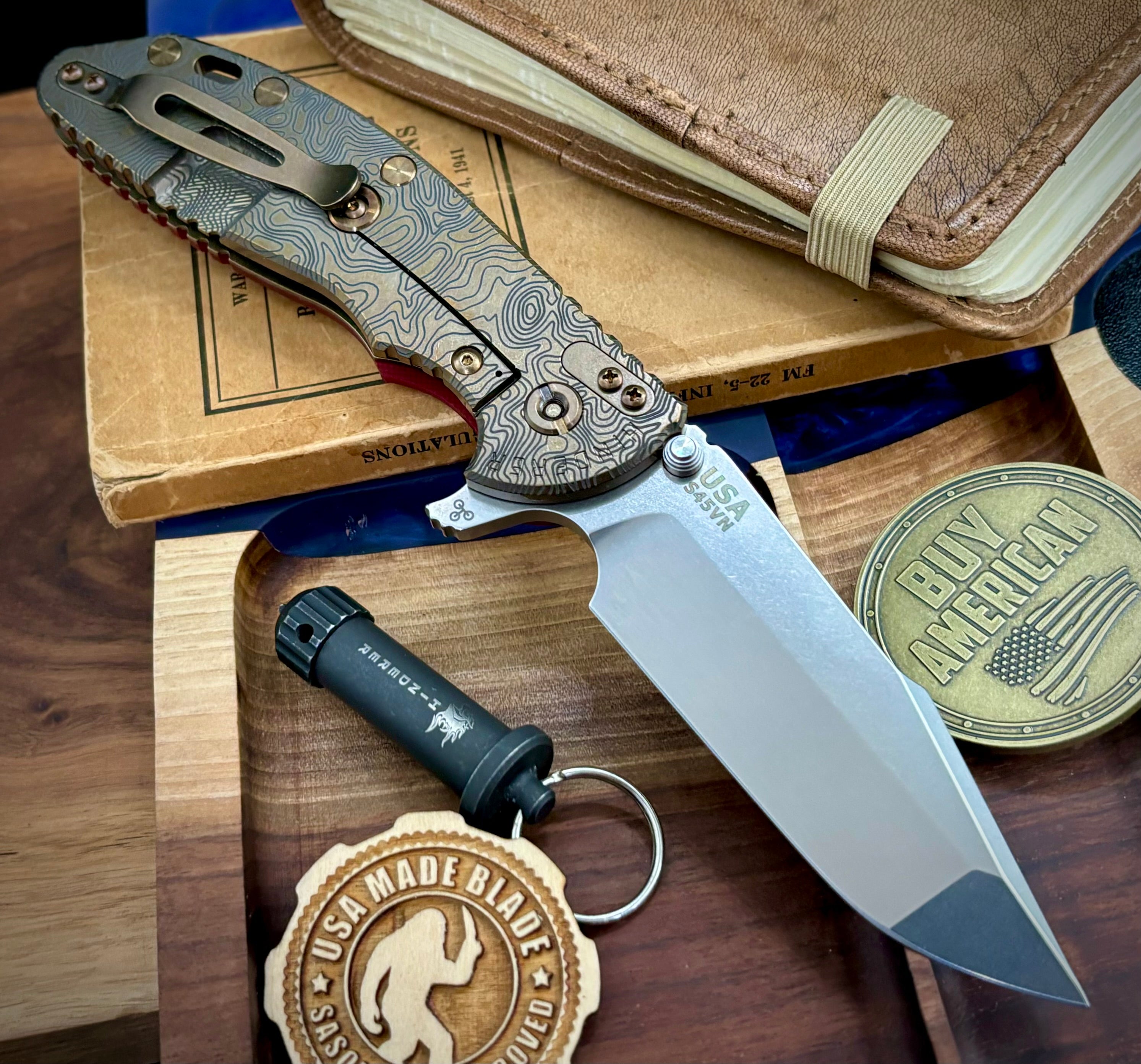 Customized in house by USA Made Blade. We took this Hinderer and customized it with a laser topo pattern. We then topped it off with bronzed out hardware! Work done does not void the Hinderer Warranty as we are Hinderers only authorized anodizing dealer.