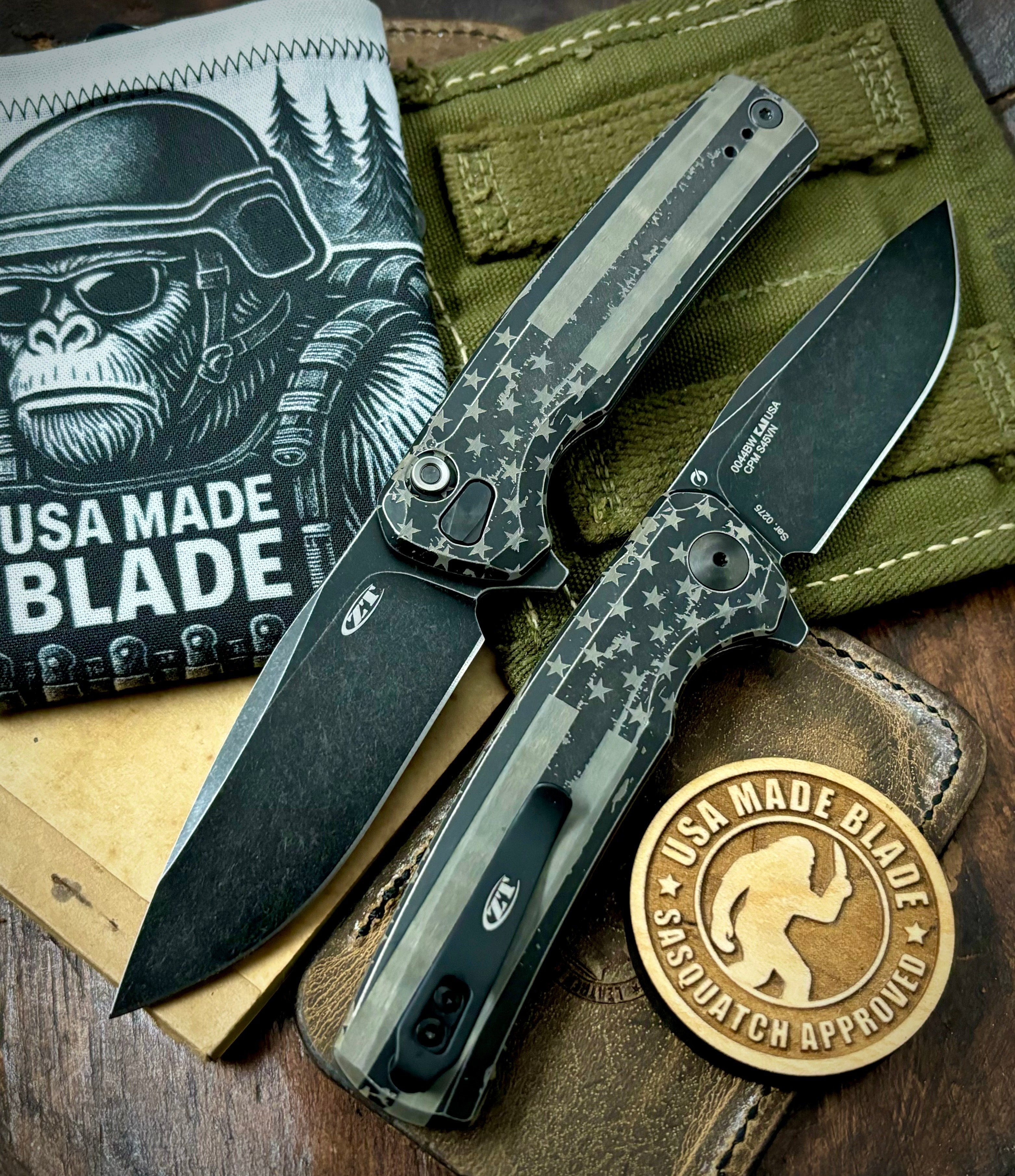 Customized in house by USA Made Blade. We took this ZT0044BW and put our Battled Stars & Stripes finish on it. This really pops with the blackwash blade and black/silver hardware. Work done does not void the ZT warranty!