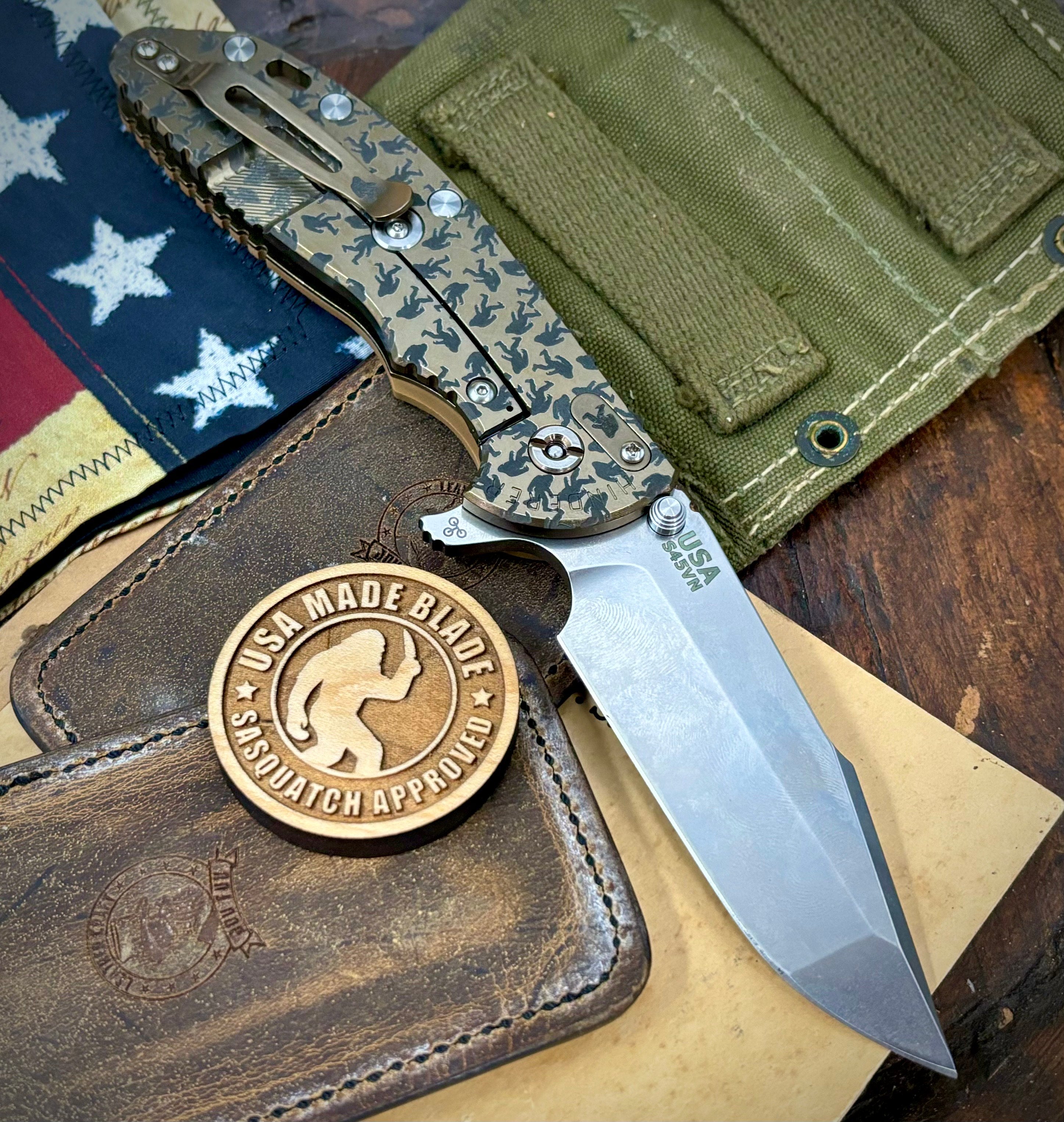 Customized in house by USA Made Blade. We engraved a perfect Chaos Sqauatch Pattern on this Hinderer XM-24 Skinny Harpoon Spanto. We then topped it off with a Sasquatch Filler Tab and a Squatch on the pocket clip. Making this the ultimate Squatch Knife!