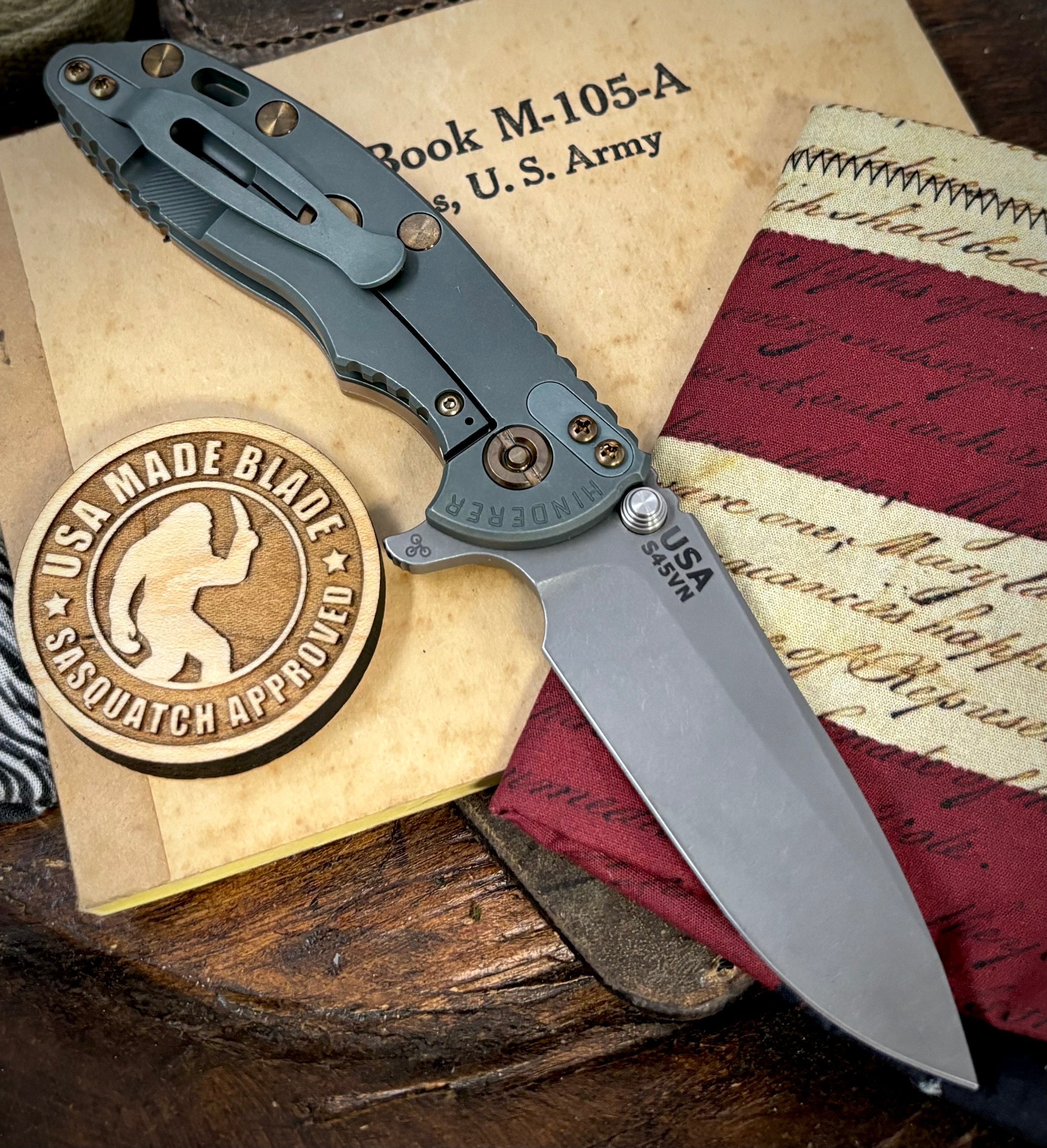Customized in house by USA Made Blade.   This Hinderer  was done up in our Ammo Can Green on the Lockside, and Liner.  We then bronze heat anodized the hardware for a stunning finish.  Work done does not void the Hinderer Warranty as we are there only authorized anodizing dealer!   ...