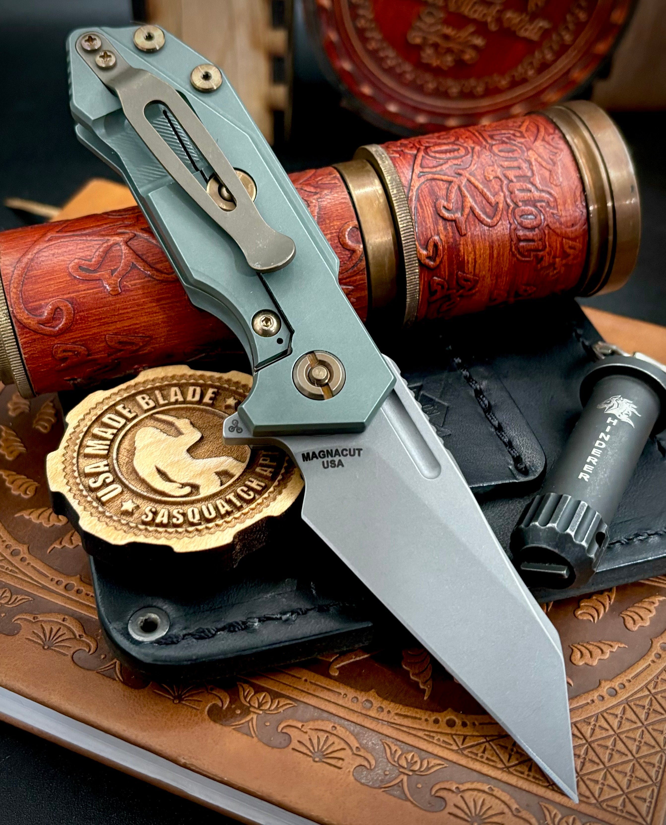 Customized in house by USA Made Blade. This Hinderer Half Track Wharnie was done up with our Ammo Can Green Ano on the ti. We then bronze heat anodized the hardware for a stunning finish. The Ammo Can Green is a darker green than the battle green and is oiled in for a stunning finish! Work done does not void the Hinderer Warranty as we are there only authorized anodizing dealer!