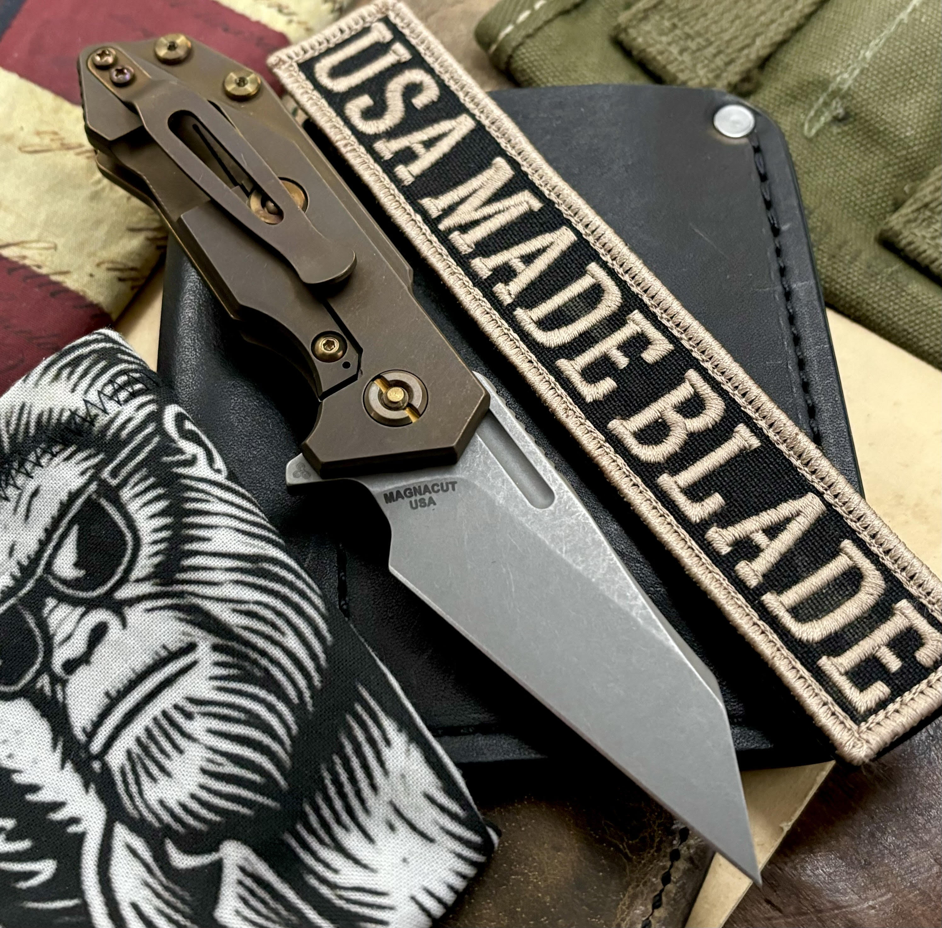 Customized in house by USA Made Blade.   This Hinderer Half Track Wharnie was done up with a Dark Battled Bronze on the Lockside, Liner, and Pocket Clip.  We then bronze heat anodized the hardware for a stunning finish Bronzed Out Finish.  Work done does not void the Hinderer Warranty as we are there only authorized anodizing dealer!